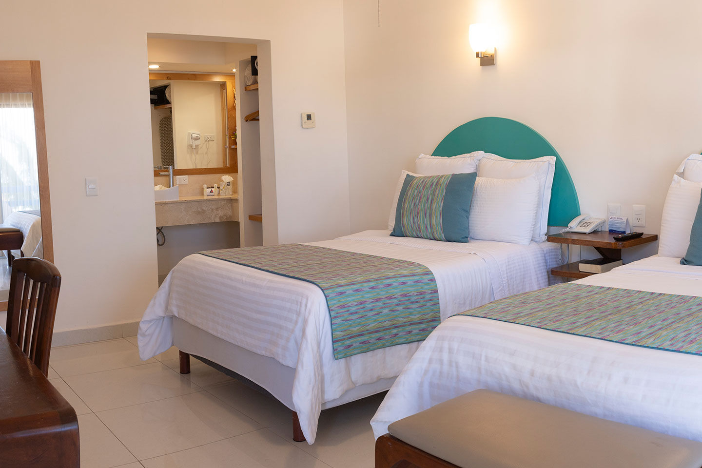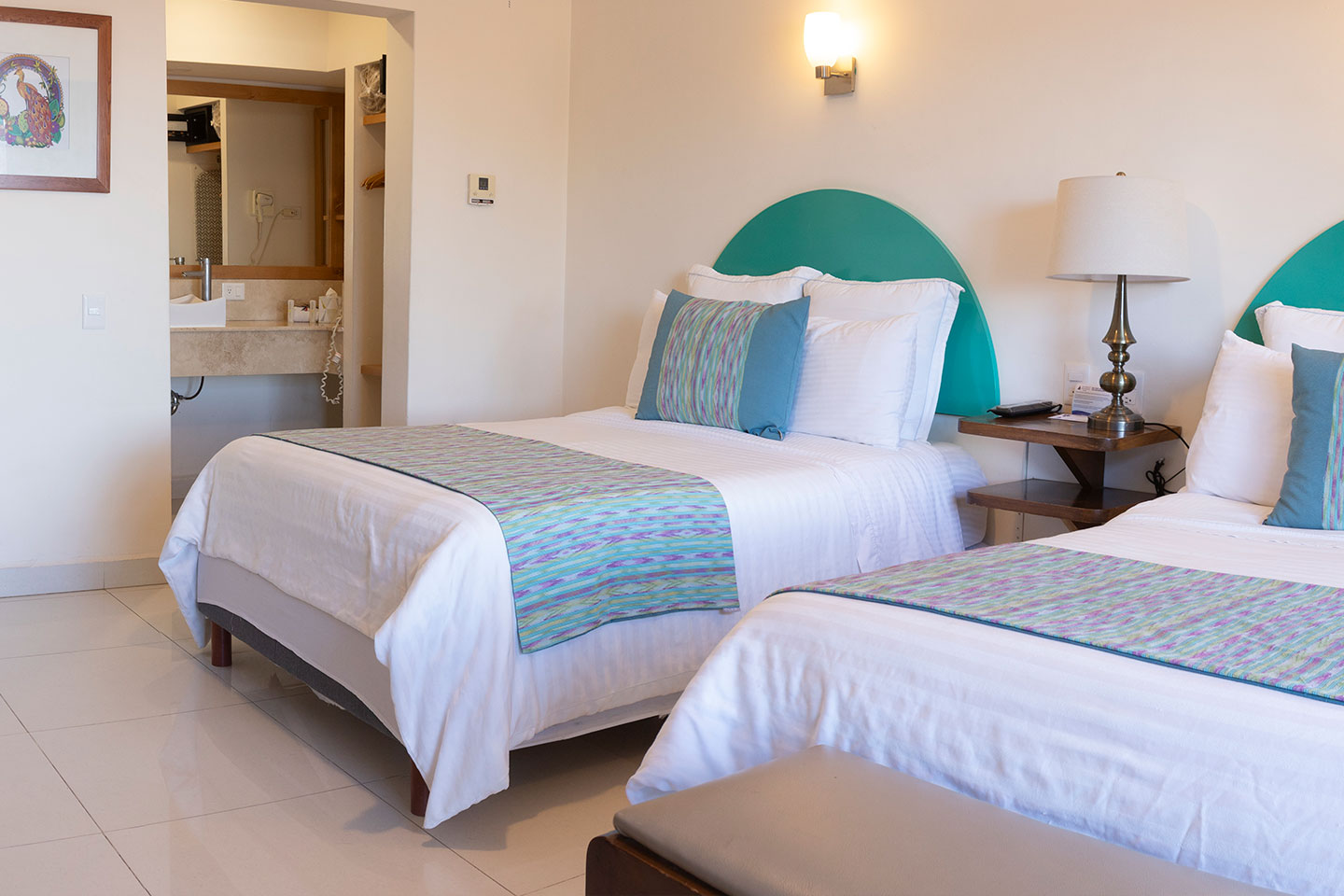 2 camas matrimoniales. Aire acondicionado tipo mini split, Smart TV de 50” con servicio de canales por cable, internet inalámbrico, escritorio, plancha y tabla para planchar, cafetera, frigobar, secadora de cabello y caja fuerte. 4 pax máximo.