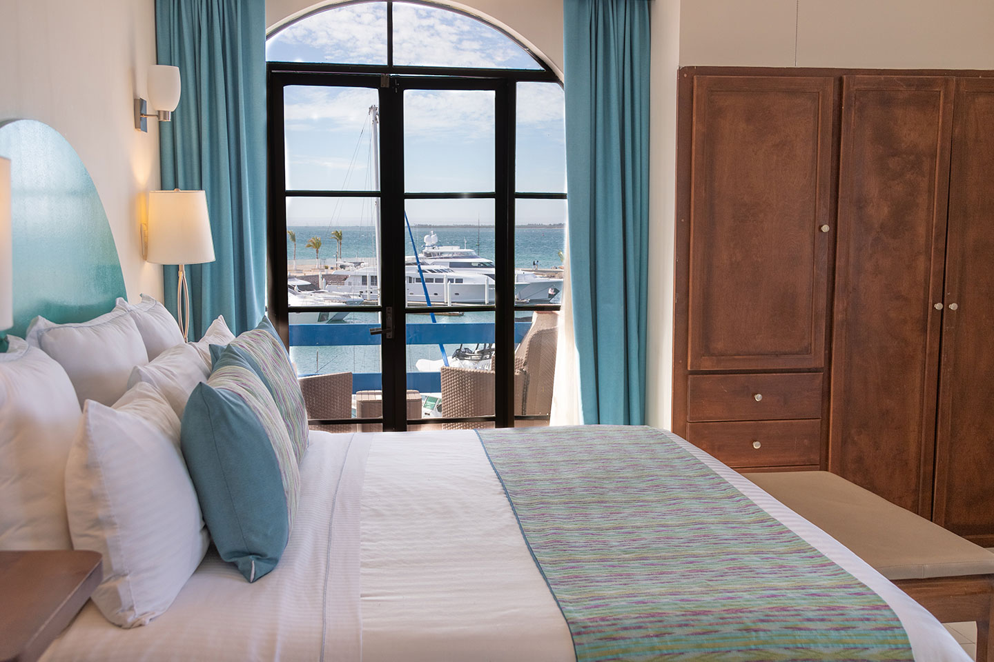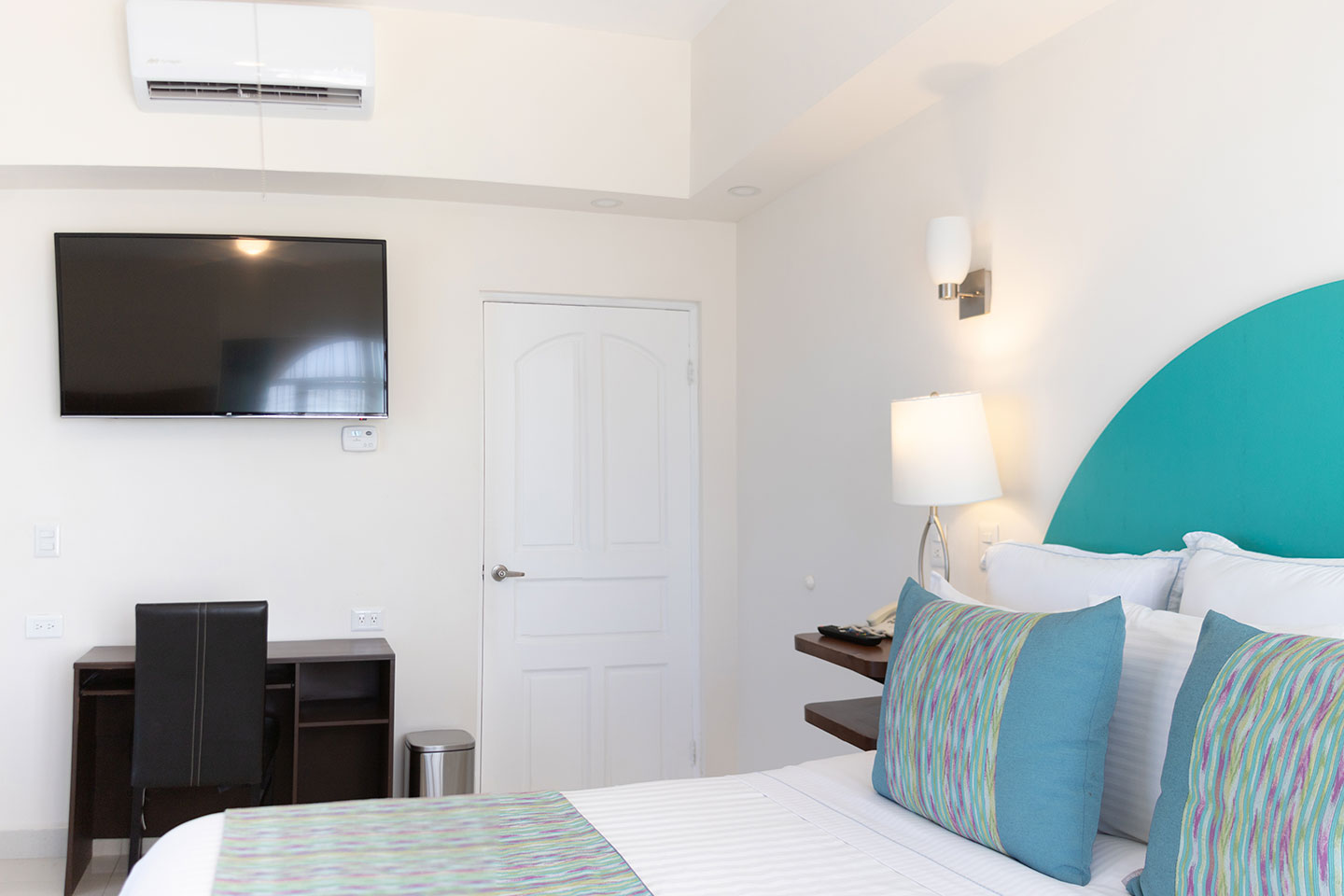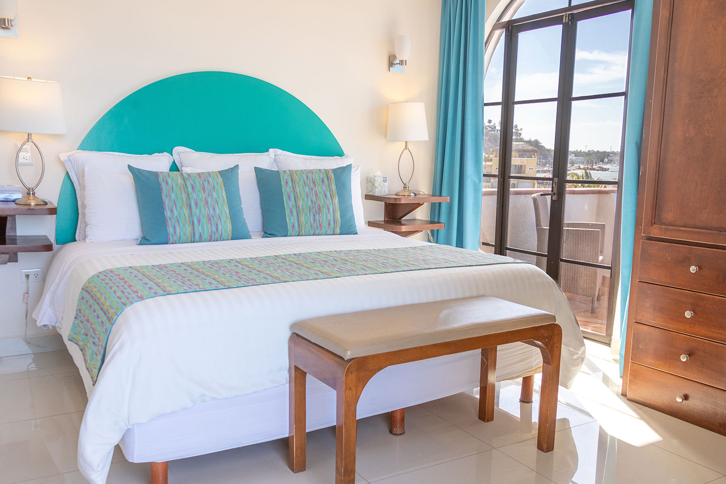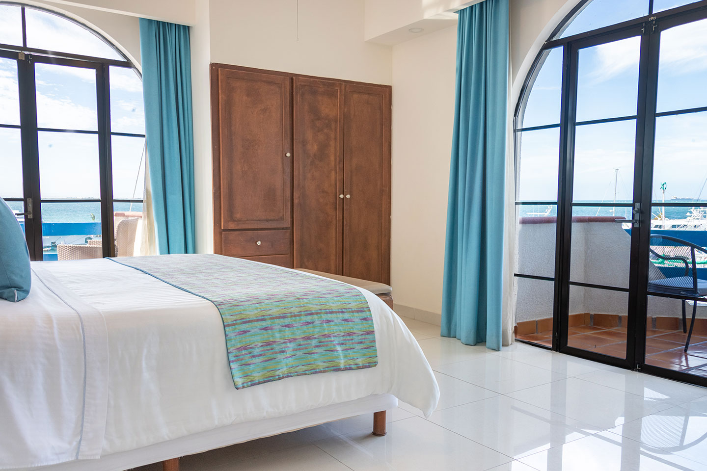 1 cama king size, baño con jacuzzi, sala, cocineta con frigobar, cafetera, aire acondicionado tipo mini split, Smart TV de 50” en recámara y sala con servicio de canales por cable, internet inalámbrico, escritorio, closet, secadora de cabello, cafetera, 3 balcones privados y vista panorámica de la bahía. 2 pax máximo.