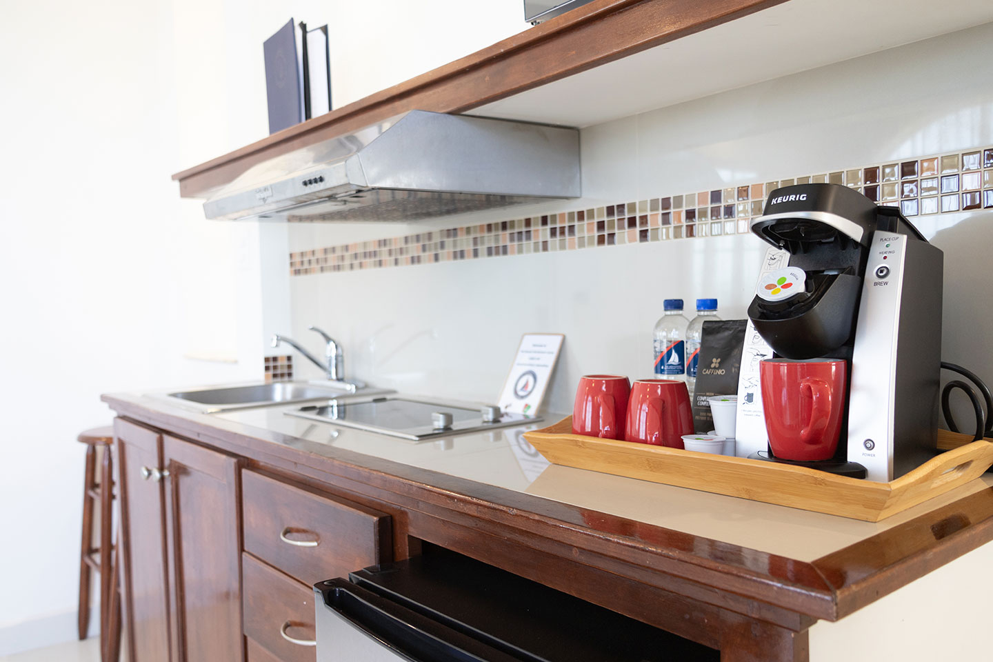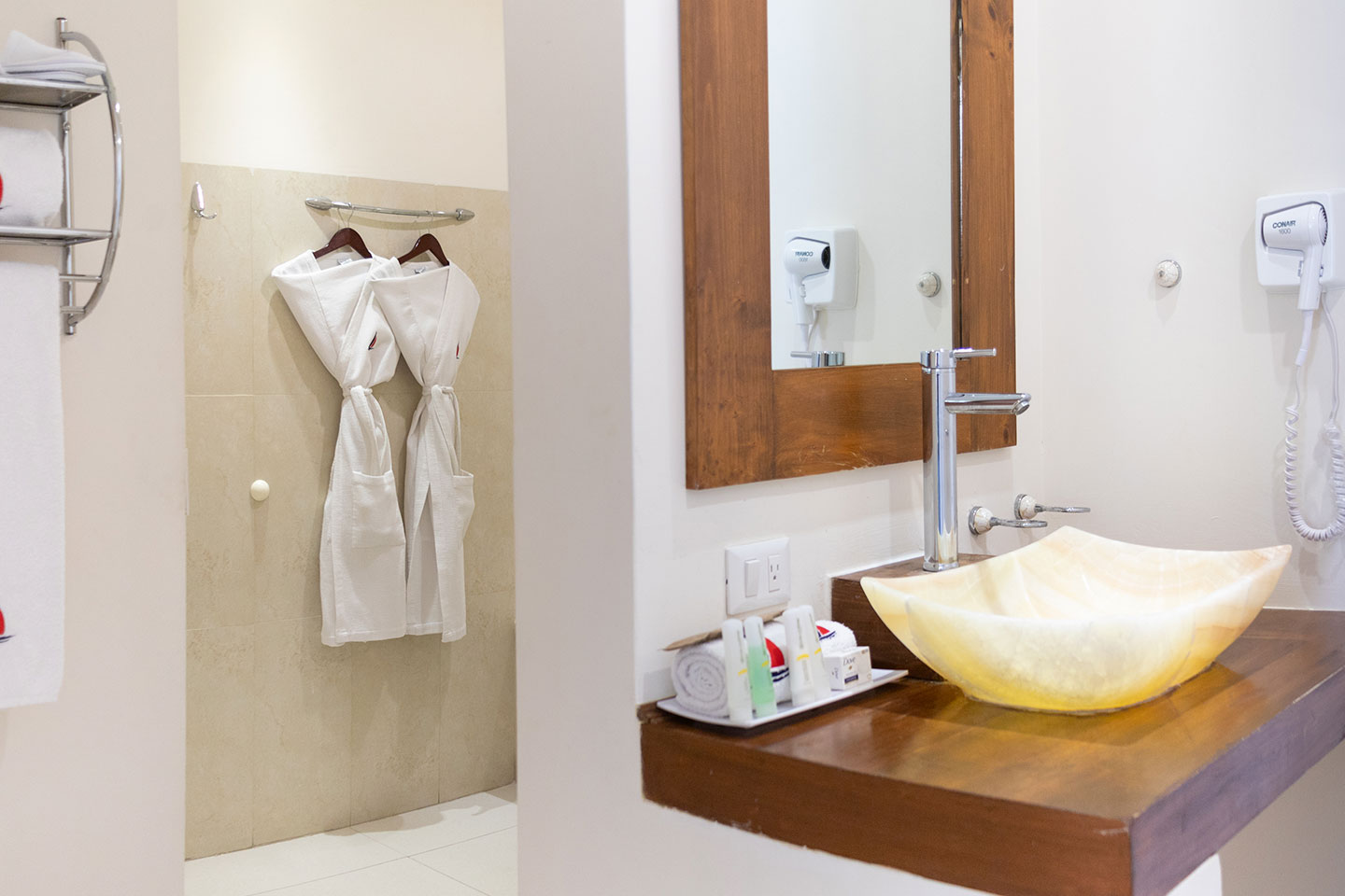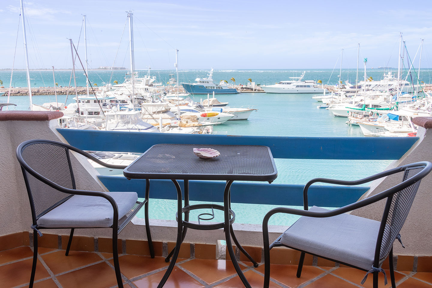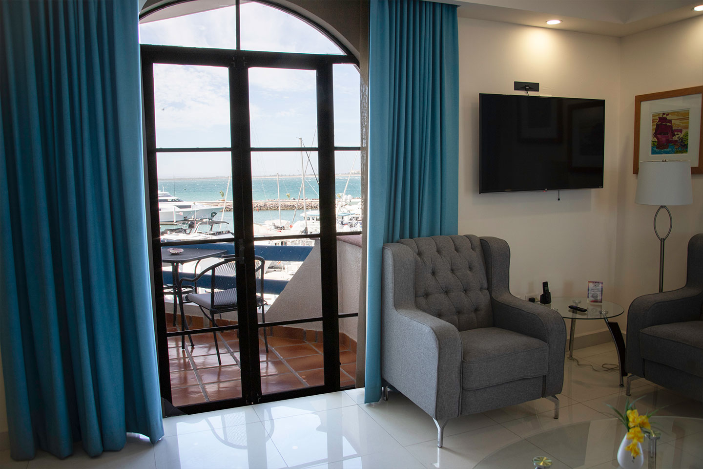 1 cama king size, baño con jacuzzi, sala, cocineta con frigobar, cafetera, aire acondicionado tipo mini split, Smart TV de 50” en recámara y sala con servicio de canales por cable, internet inalámbrico, escritorio, closet, secadora de cabello, cafetera, 3 balcones privados y vista panorámica de la bahía. 2 pax máximo.